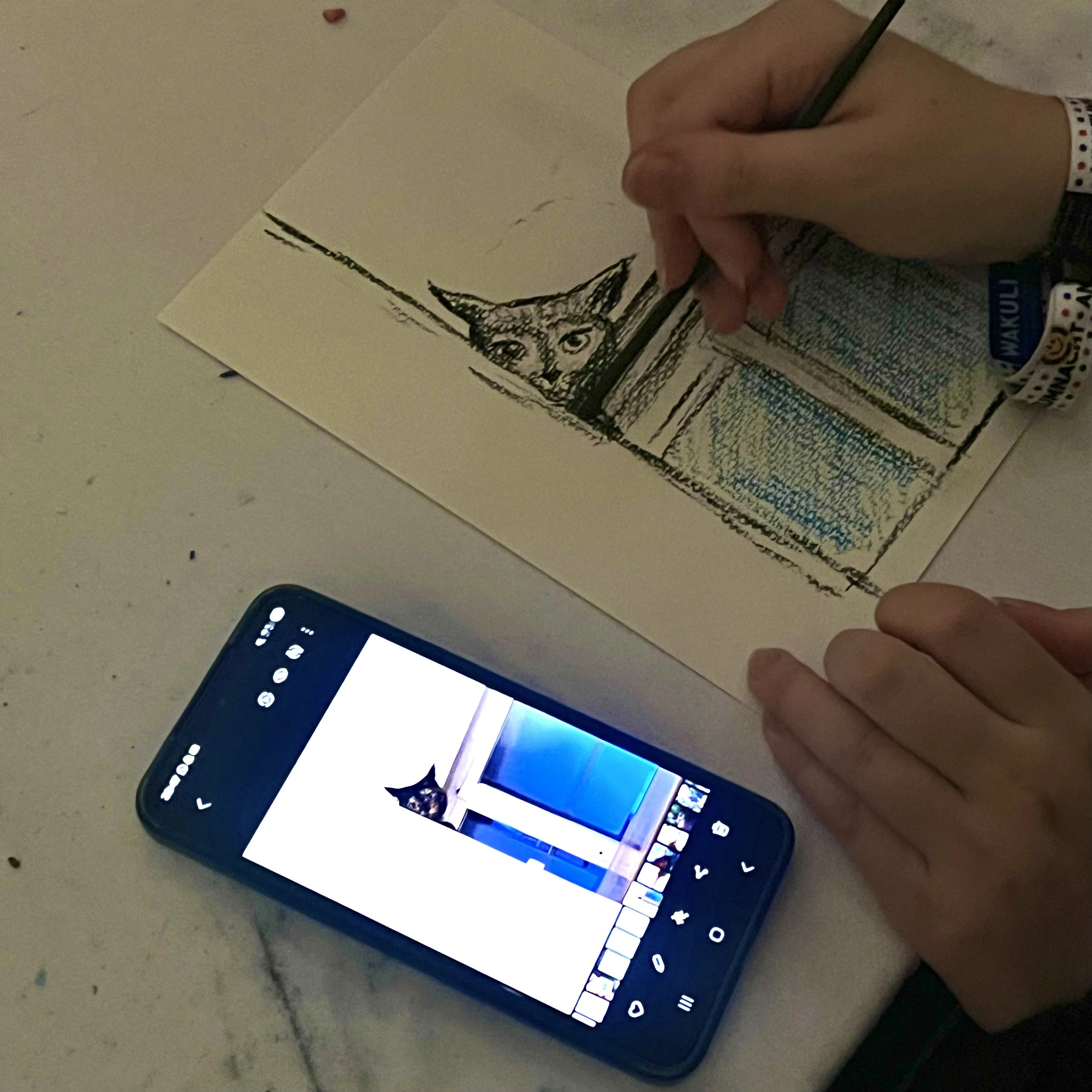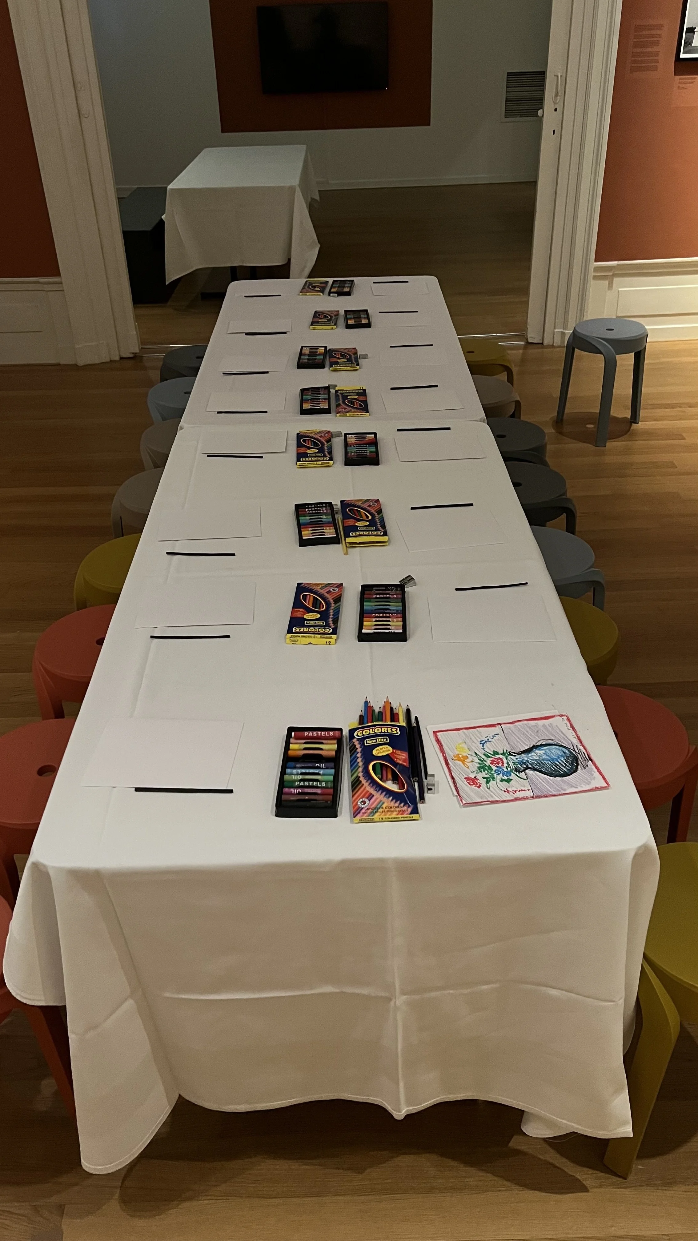 I was commissioned to design and deliver a high-volume drop-in workshop inside the Augusta Curiel exhibition during Museumnacht. Working within strict conservation guidelines, I developed a dry-materials drawing experience using oil pastels, charcoal and coloured pencils. Over 300 visitors participated throughout the night, each creating a rapid artwork from their personal photo archives.
